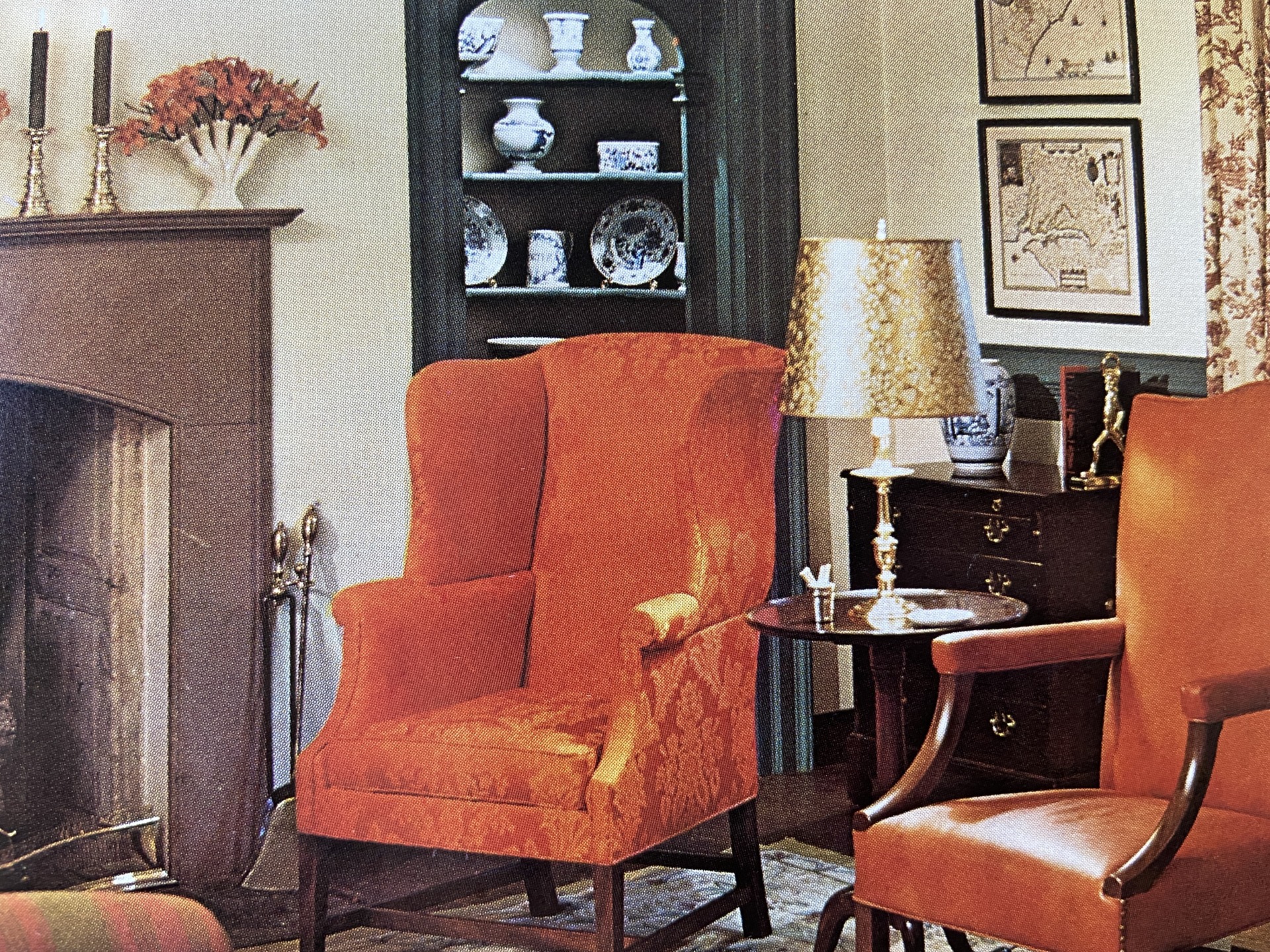 At right, a photo of its trivets, placed in a modern decorating scheme, from the 1982 Williamsburg Reproductions catalog. Also pictured, its brass items as seen among the other reproductions in a Colonial Williamsburg catalog.